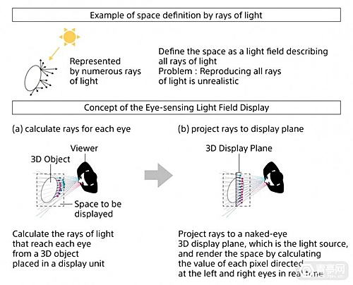 不過,考慮到空間中存在大量光線,重現(xiàn)全部光線并不實際,因此索尼ELF技術(shù)僅渲染對圖像必要的光線。索尼開發(fā)的3D顯示系統(tǒng),結(jié)合眼球追蹤數(shù)據(jù)來計算并顯示,觀看者視角能看到的光線,而且可以根據(jù)視角變化而動態(tài)更新渲染內(nèi)容。